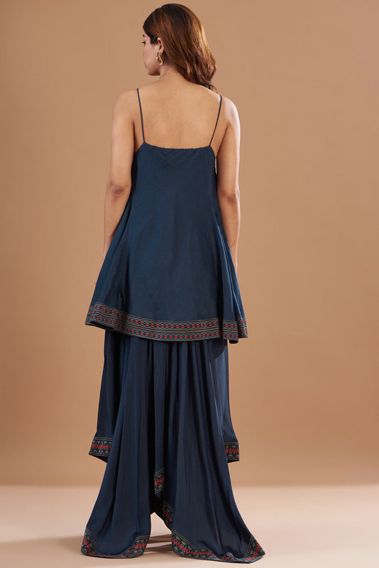 Blue Chanderi Printed & Embroidered Draped Skirt Set