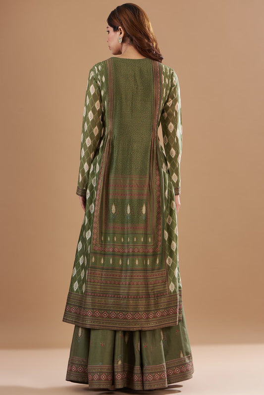 Green Chanderi Printed & Embroidered Skirt Set