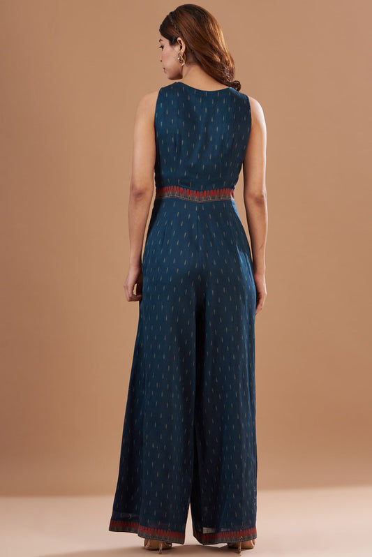 Blue Chanderi Printed & Embroidered Jumpsuit