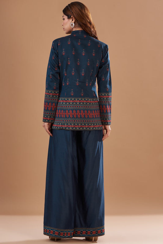 Blue Chanderi Printed Jacket Set
