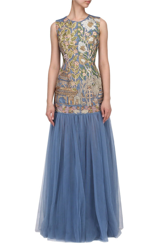 Greyish Slate Blue Floral Embroidered Gown