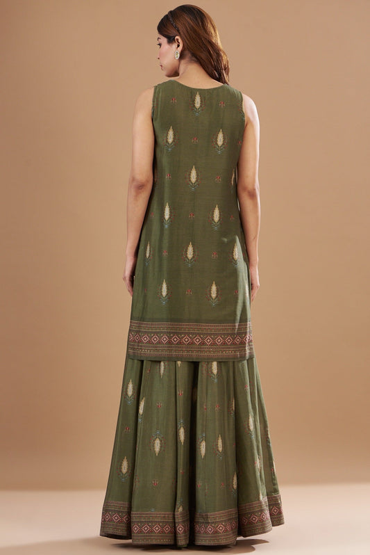 Blue Chanderi Printed & Embroidered Draped Skirt Set