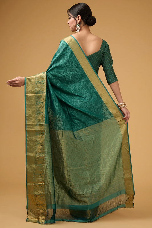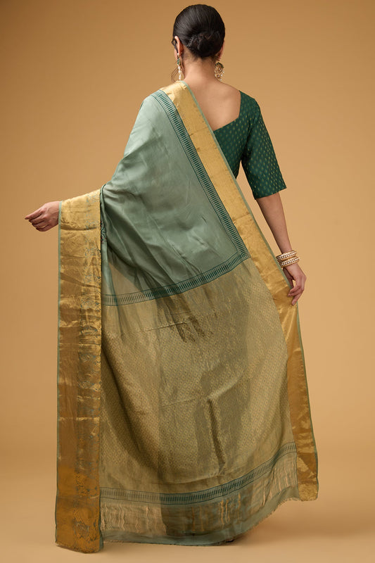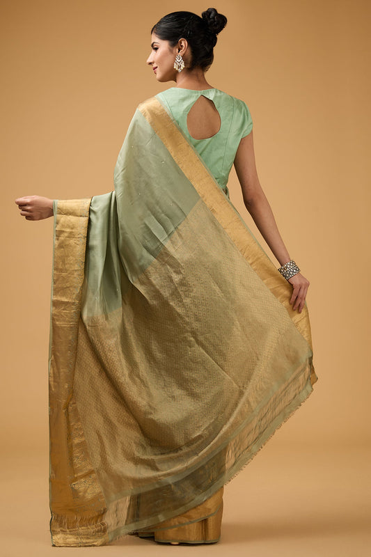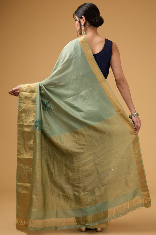 Pista Green Silk Floral Motif Embroidered Saree Set