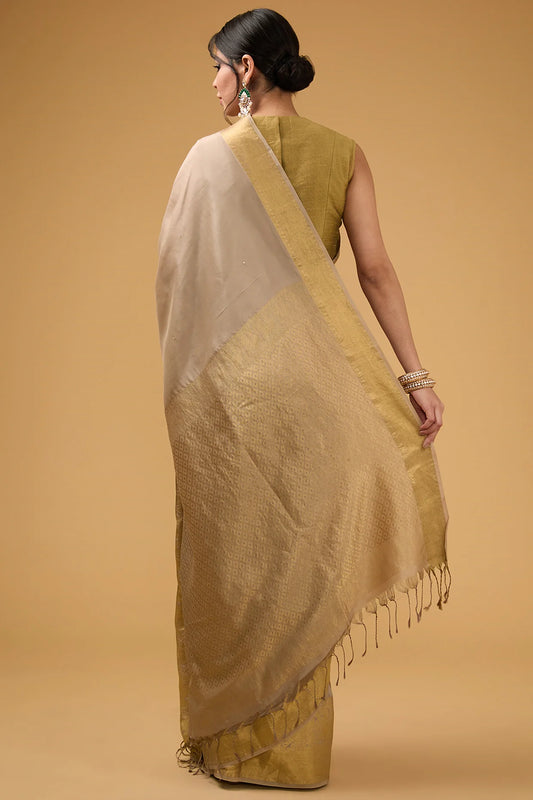 Beigish-Peach Silk Floral Embroidered & Printed Saree Set