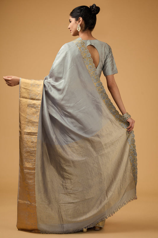 Grey-Olive Green Silk Sequins Motif Embroidered Saree Set