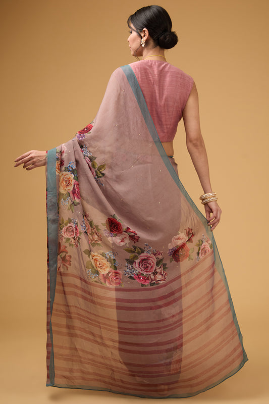Dusty Onion Peach Georgette Floral Digital Printed Saree Set