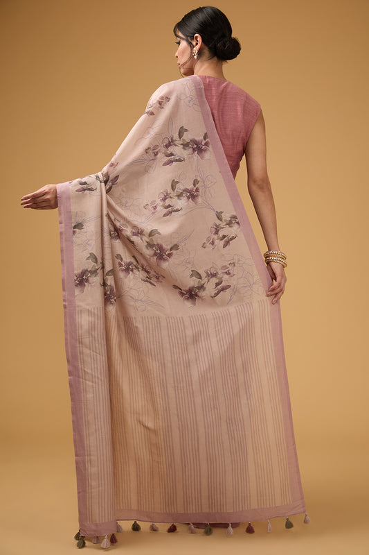 Peachish Pink Chanderi Floral Digital Printed Saree Set