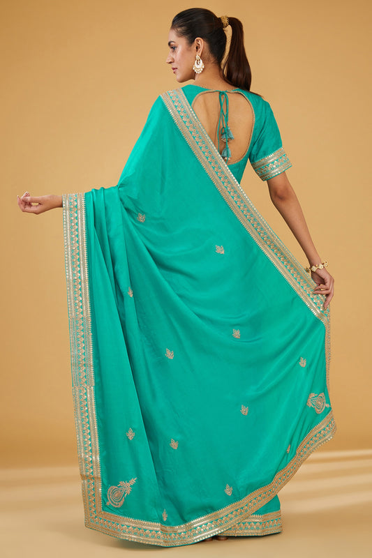 Turquoise Silk Blend & Viscose Zari Embroidered Saree Set
