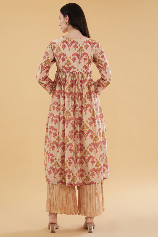 Beige Cotton Silk Floral Printed Flared Kurta Set