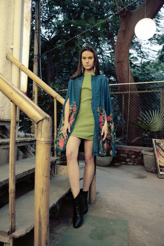 Teal heavily embroidered long jacket with Green Lehanga skirt set