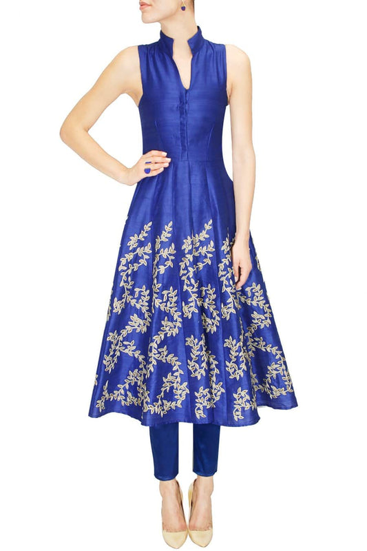 Amyra Dastur in Cobalt Blue Long Leaf Embroidered Dress with Fitted Pants