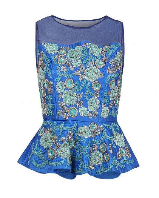 Cobalt blue sequined peplum jacket with fitted pants