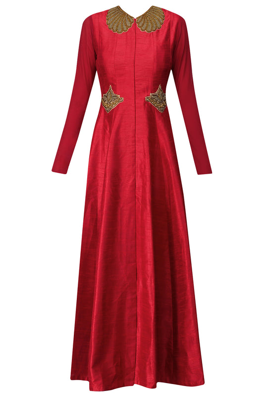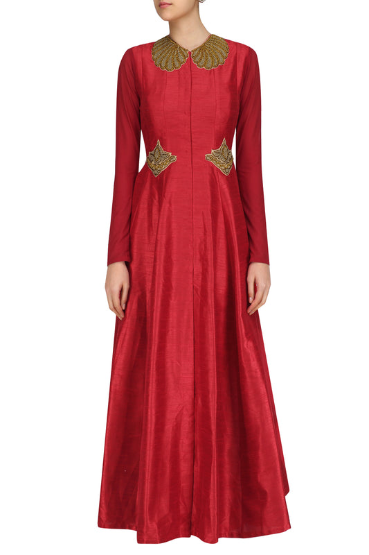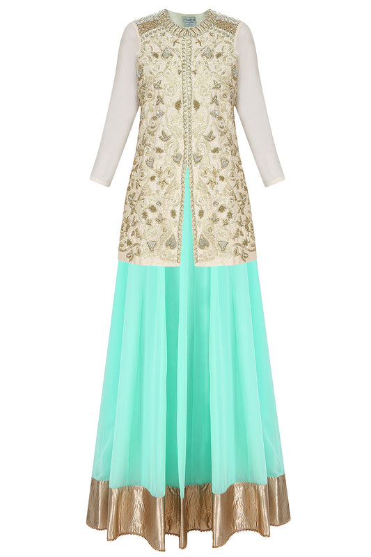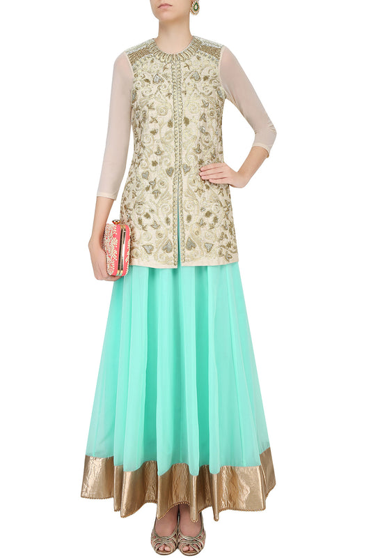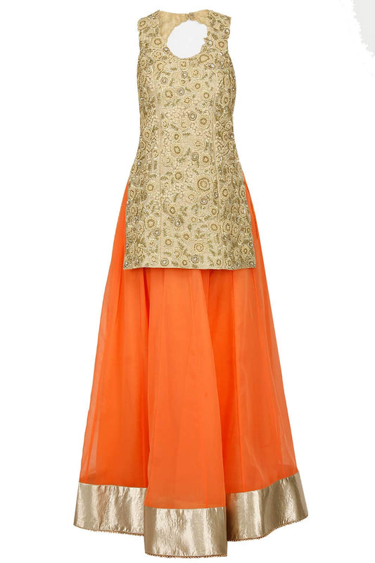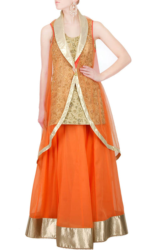 Gold Long Zardozi Top with Peach Georgette Skirt & Net Jacket