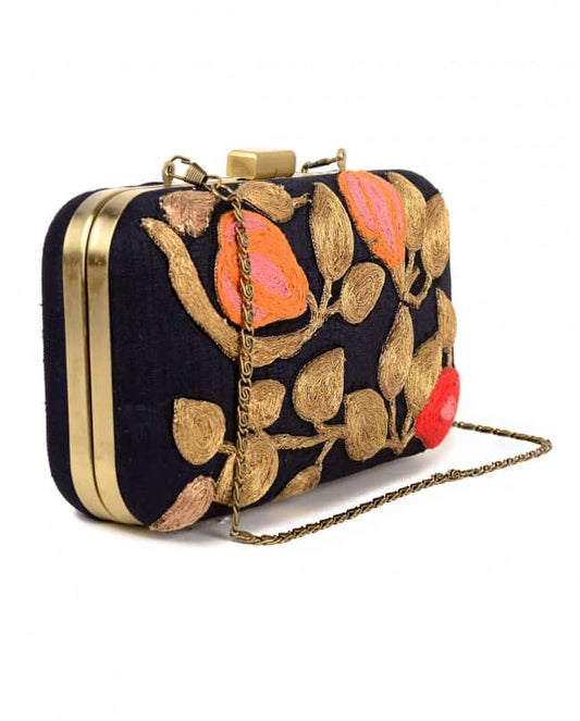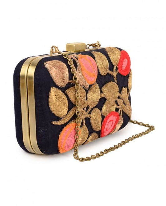 Round Navy Blue Forest Print and Leaf Embroidered Box Clutch Bag