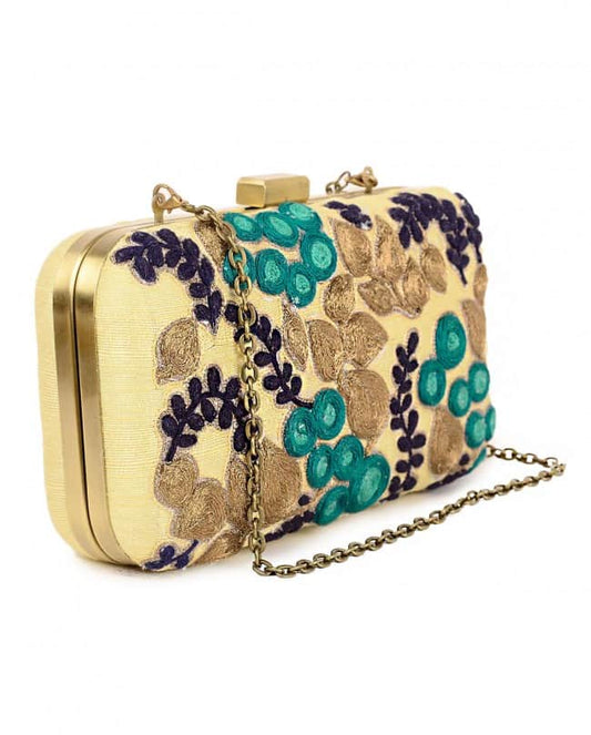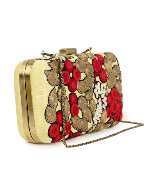 Cottage Garden Embroidered Ivory Clutch with Gold Chain