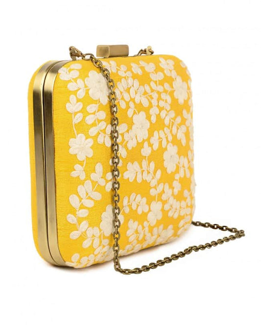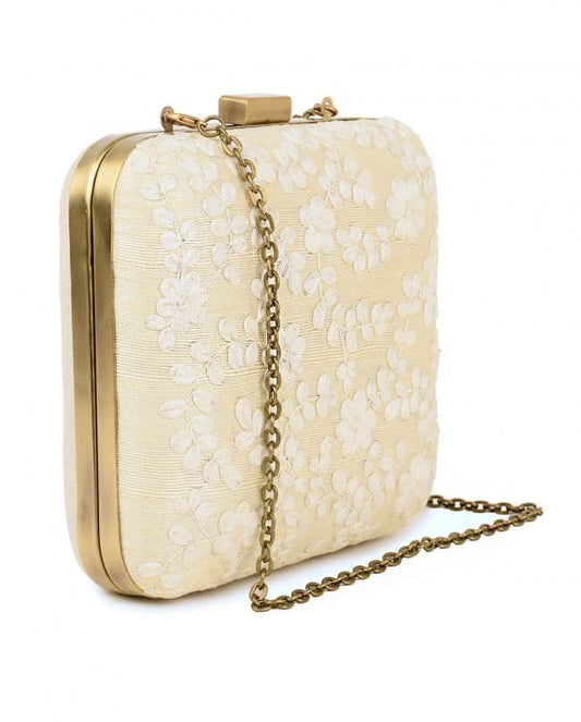 Golden Bee Embroidered Clutch in Ivory Satin with Floral Detailing