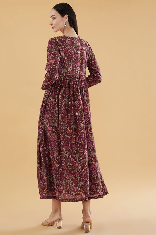 Maroon Cotton Silk Floral Printed Midi Dress With Scarf