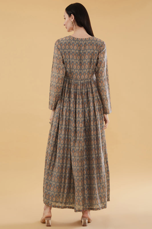 Teal Blue Cotton Silk Floral Printed Maxi Dress