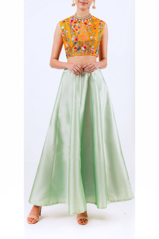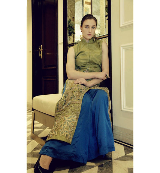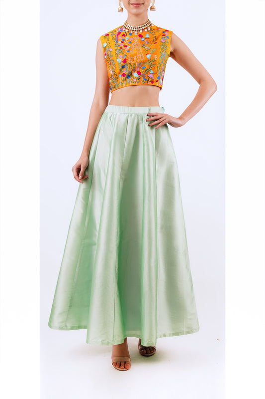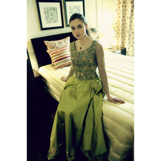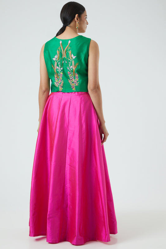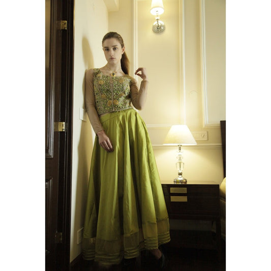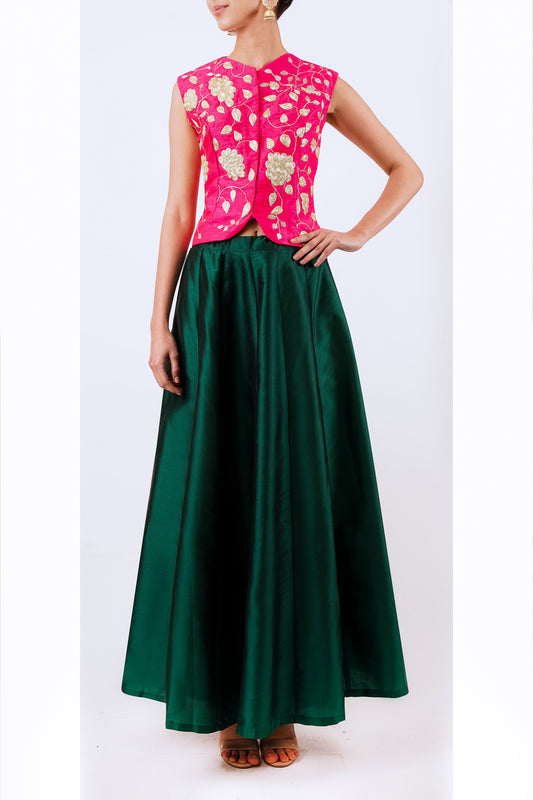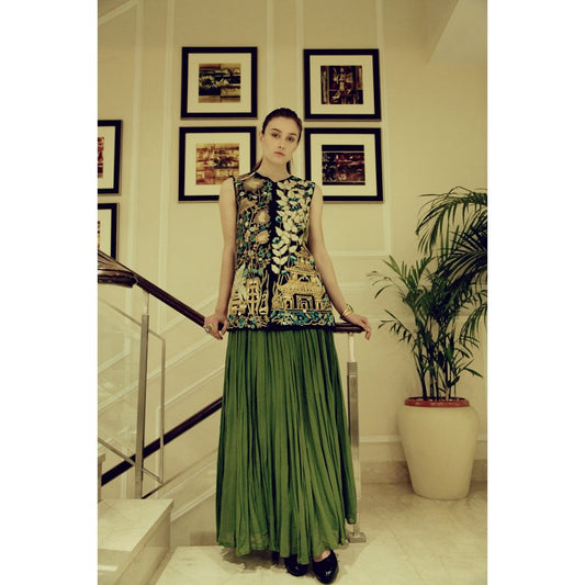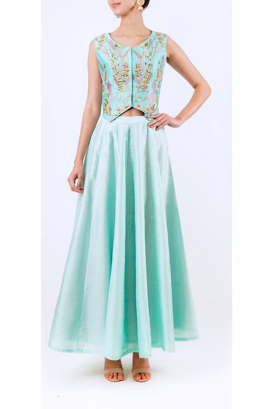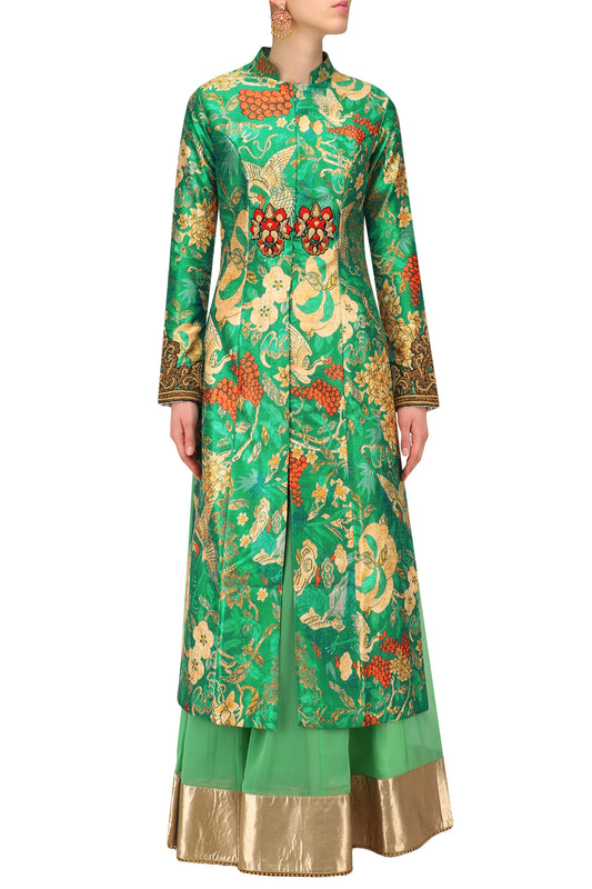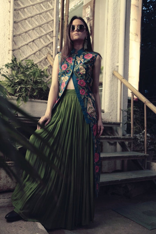 Teal heavily embroidered long jacket with Green Lehanga skirt set