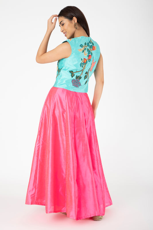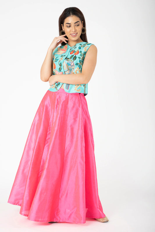 Turquoise Embroidered Jacket With Candy Pink Lehenga