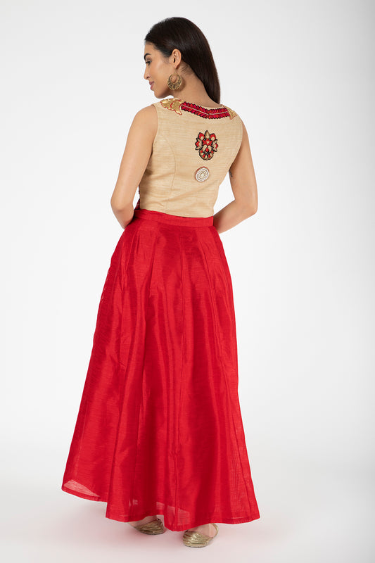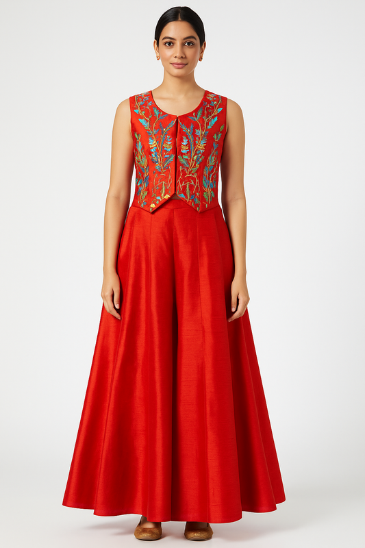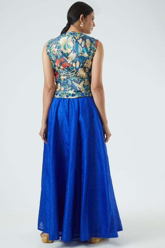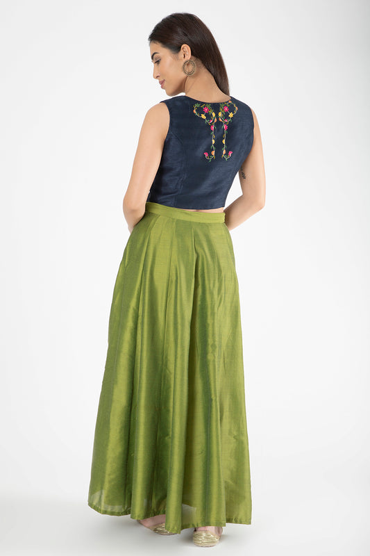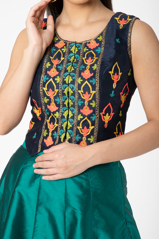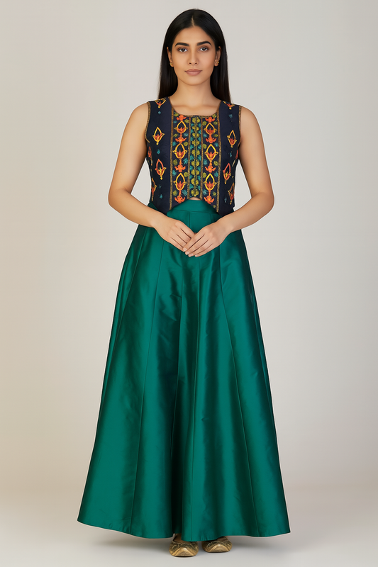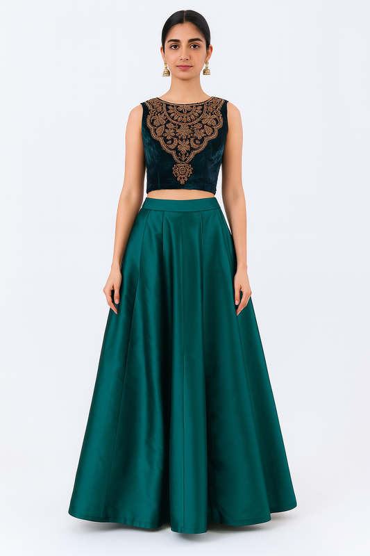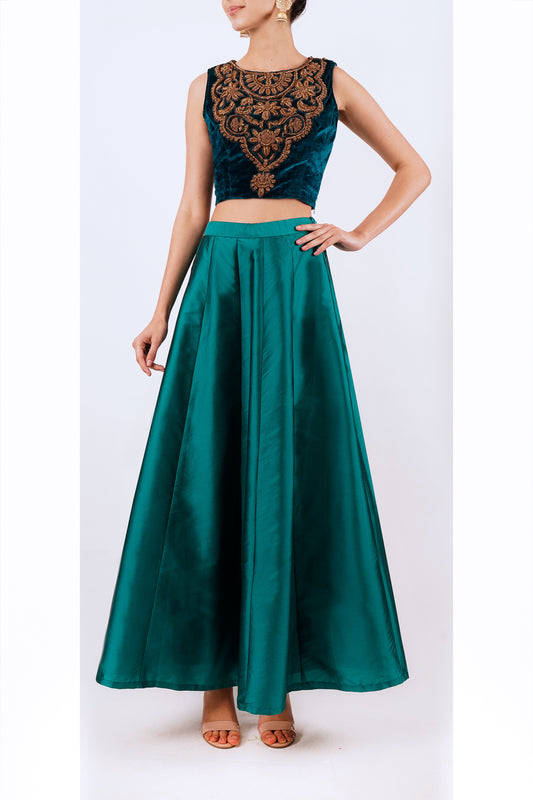 Dark teal velvet embroidered top with teal tafetta silk skirt