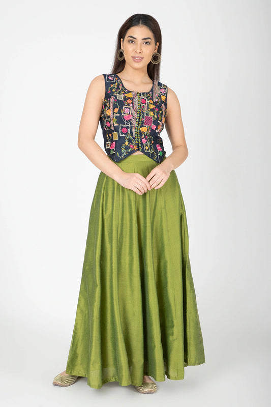 Navy Blue Embroidered Jacket With Mehendi Green Lehenga