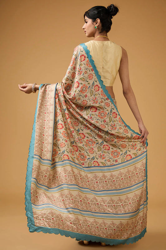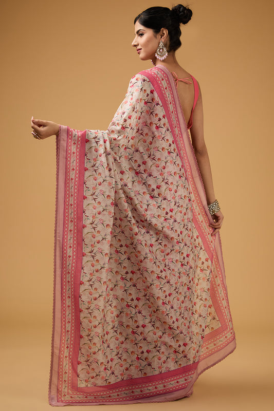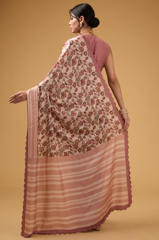 Peachish Pink Viscose Floral Digital Printed Scalloped Saree Set