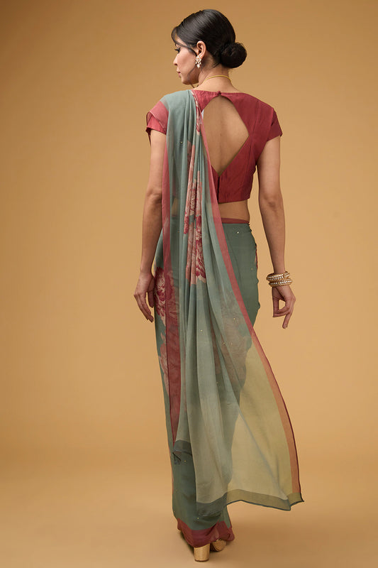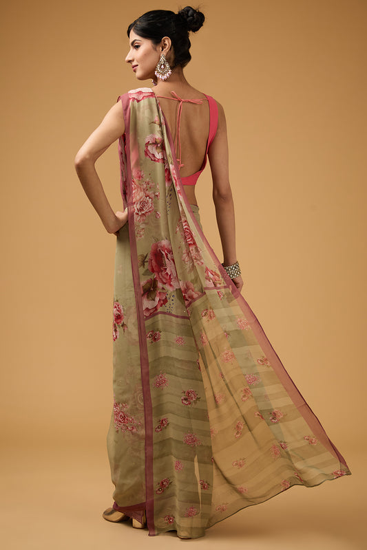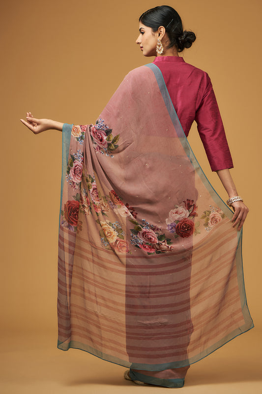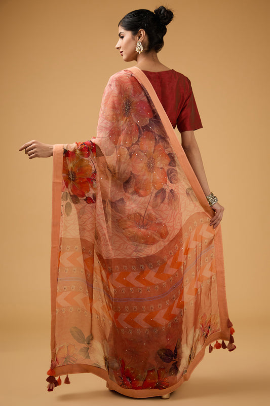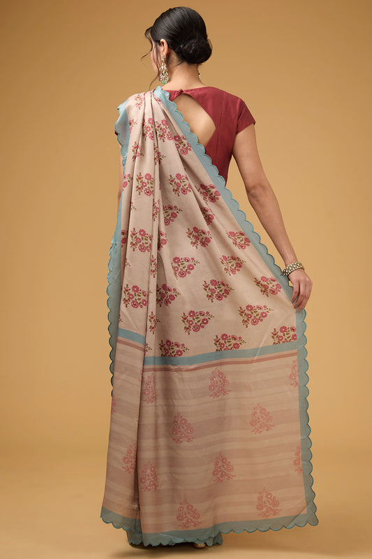 Peachish Pink Georgette Floral Digital Printed Scalloped Saree Set