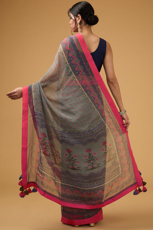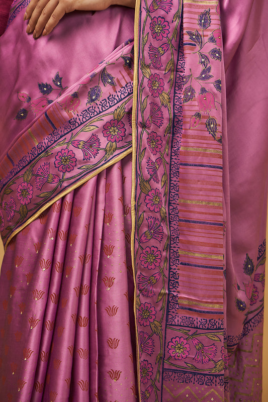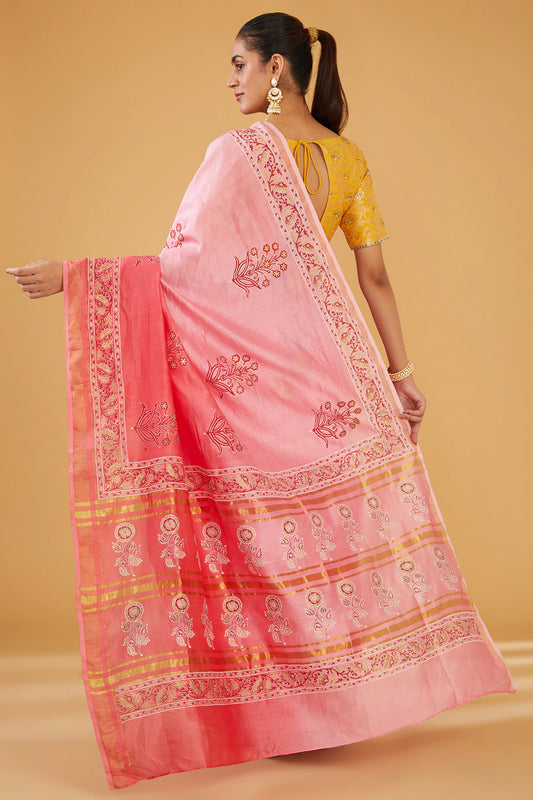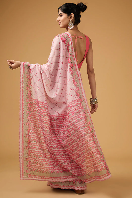 Pink Silk Blend & Viscose Floral Embroidered Saree Set