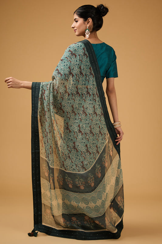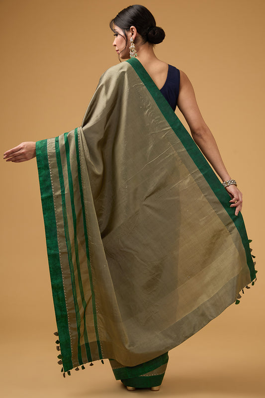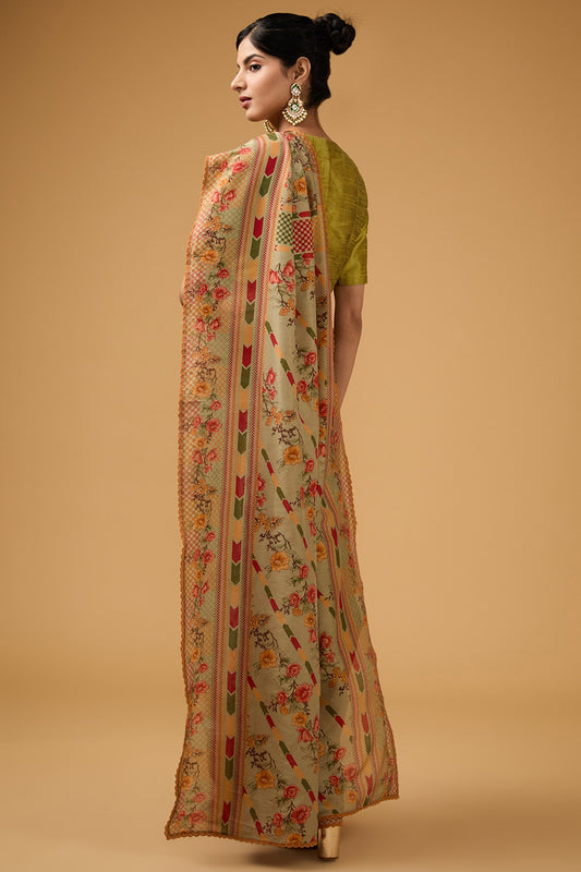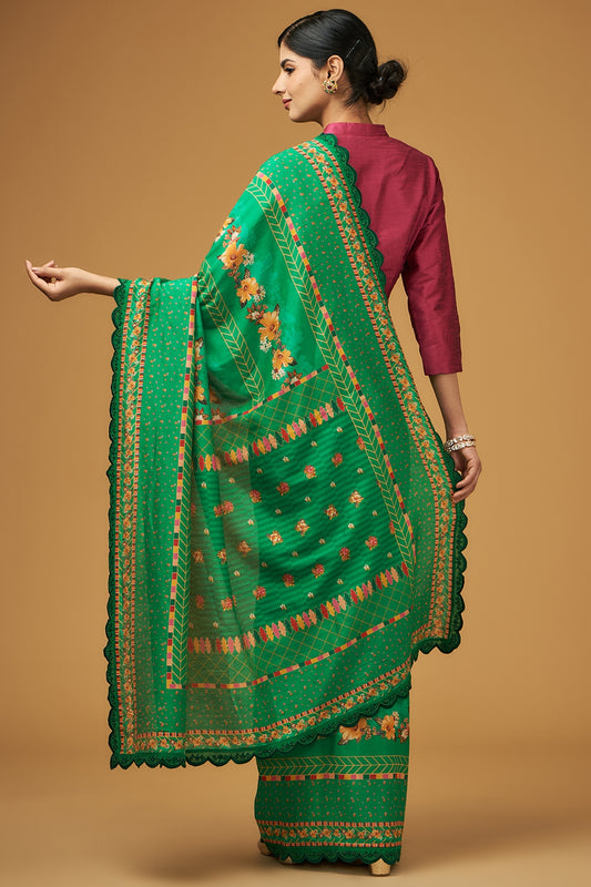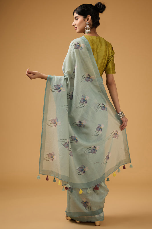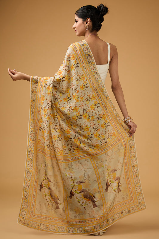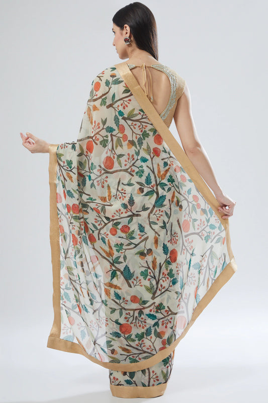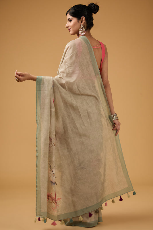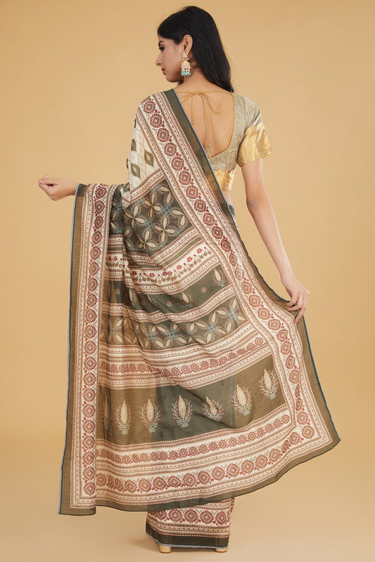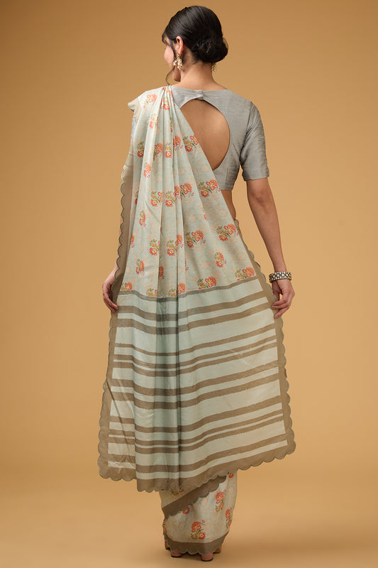 Ivory & Green Cotton Silk Floral Printed Saree Set