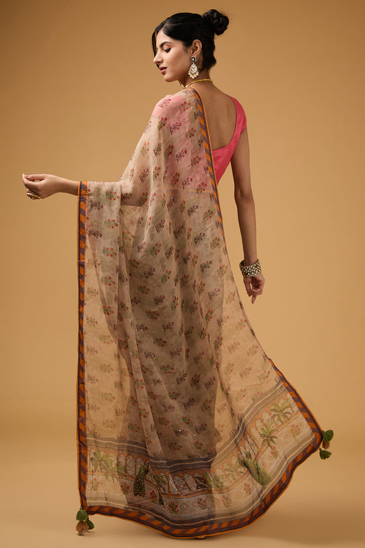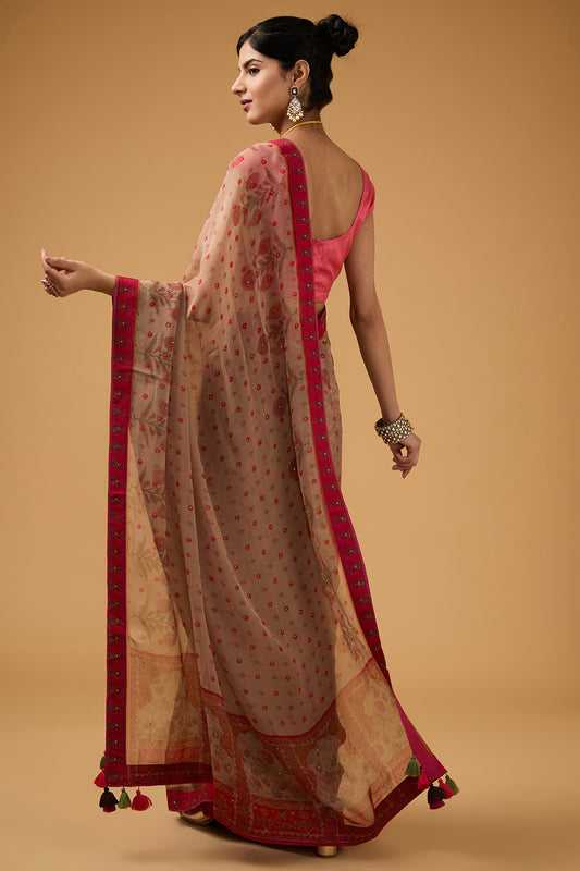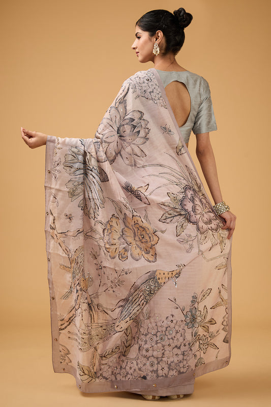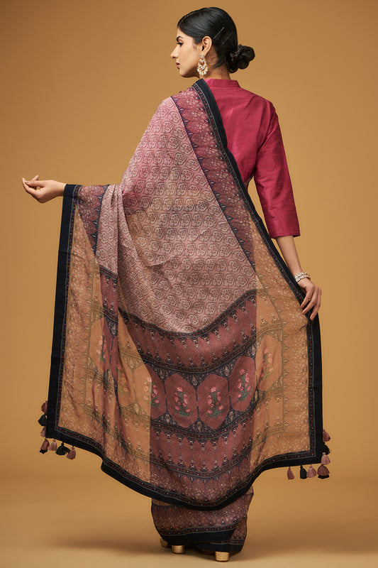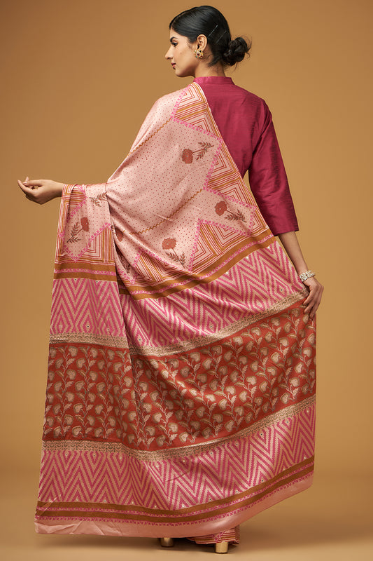Peach Pink Viscose Modal Silk Floral Printed Saree Set
