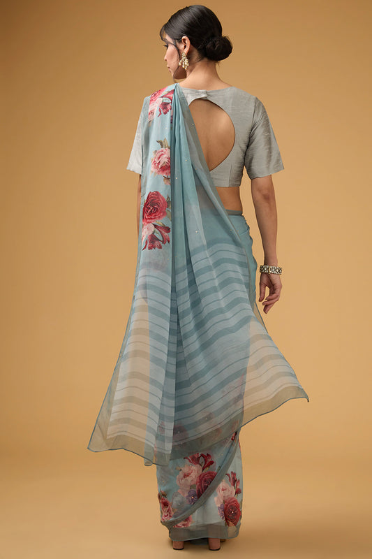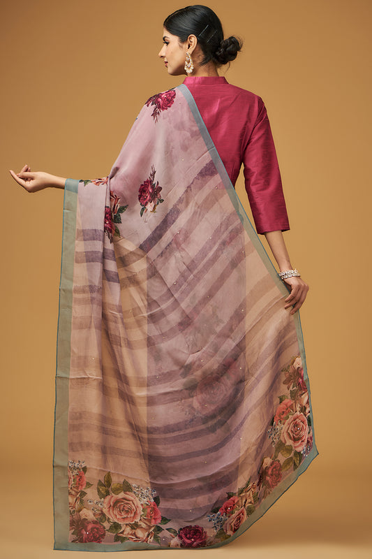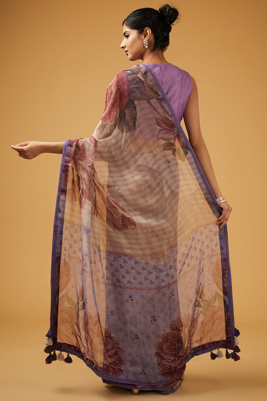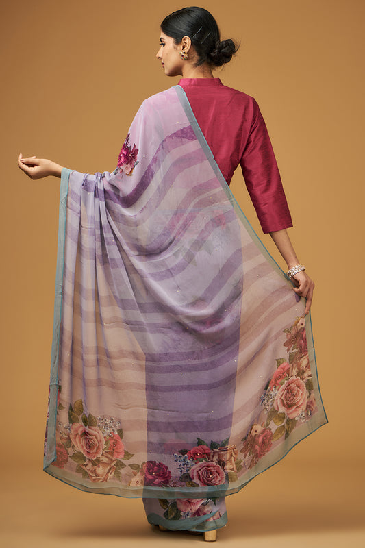 Purple Georgette Modal Silk Floral Printed Saree Set