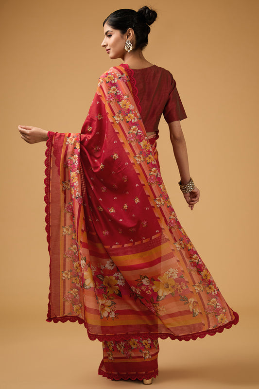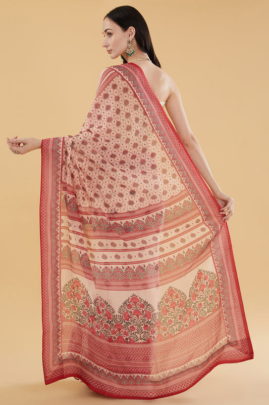 Peach & Red Cotton Silk Floral Printed Saree Set