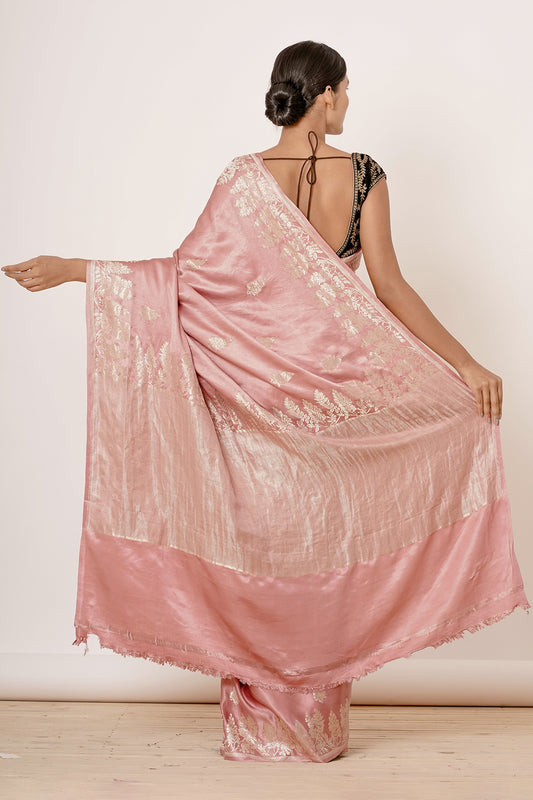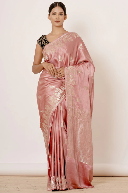 Onion Pink Pure Satin Silk Zari Embroidered Saree Set
