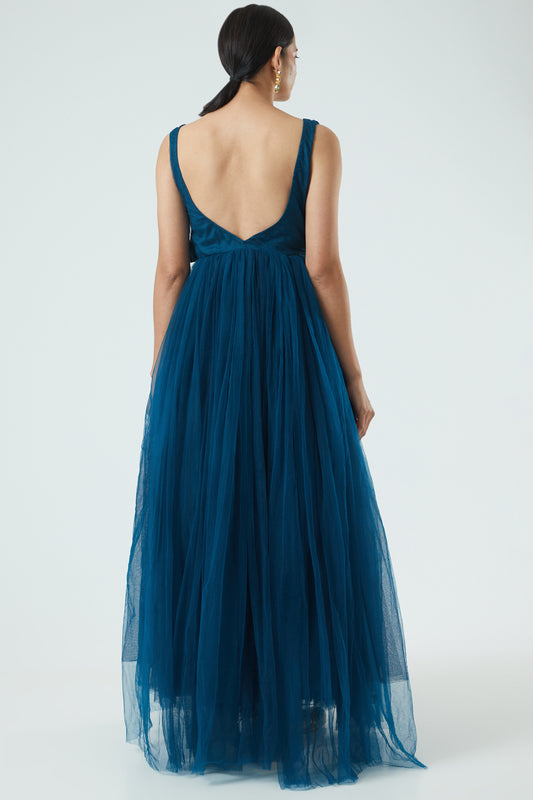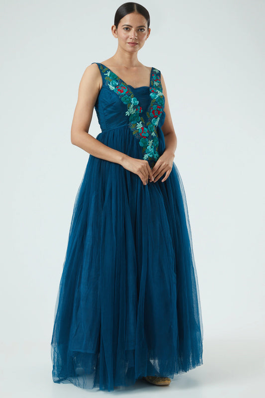 Navy Blue Net & Georgette Floral Embroidered Saree Set