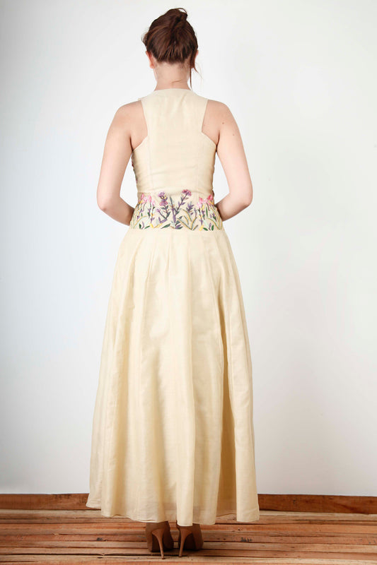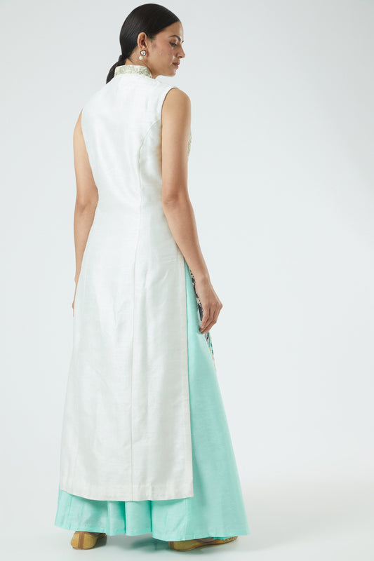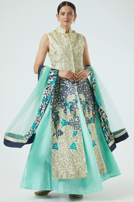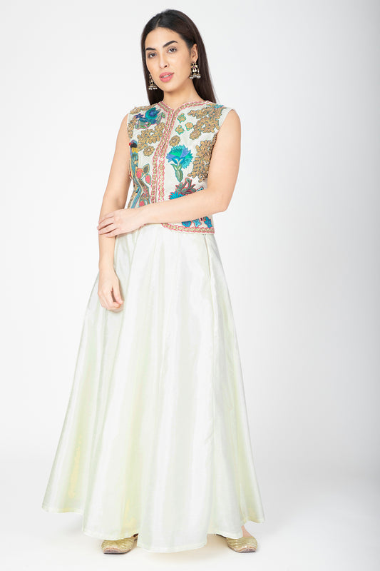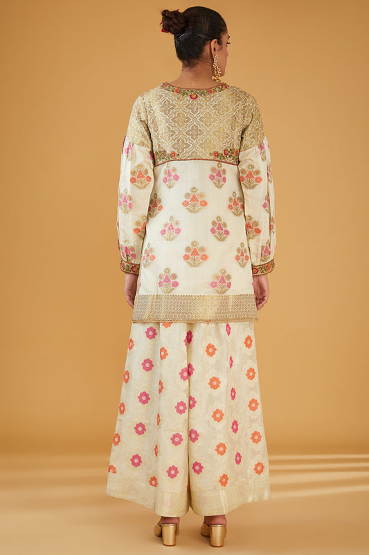 Ivory Silk Blend Floral Printed & Zari Embroidered Kurta Set