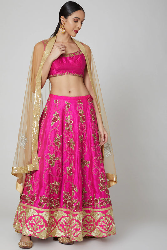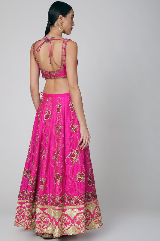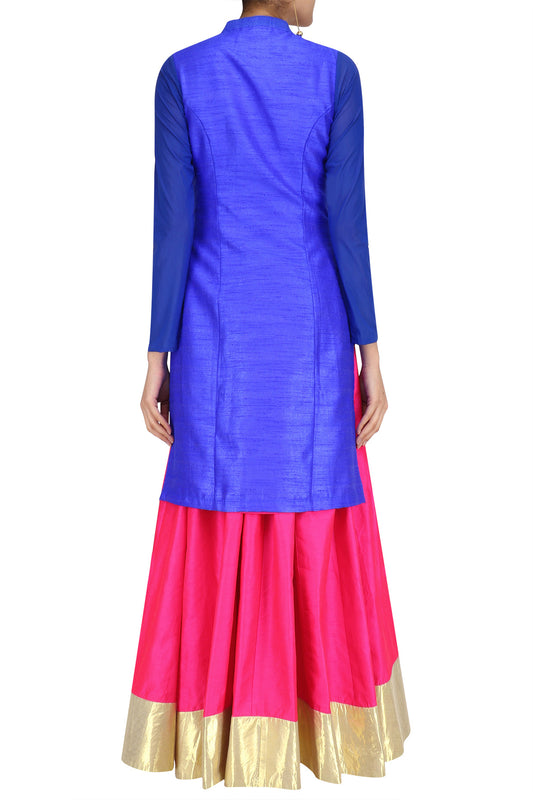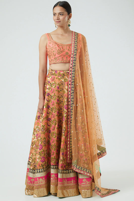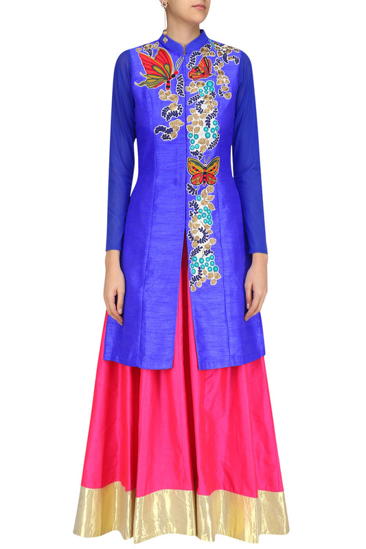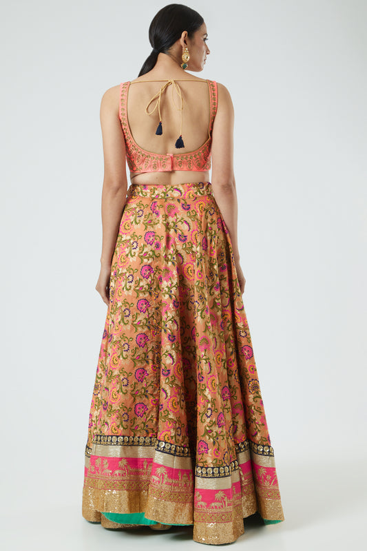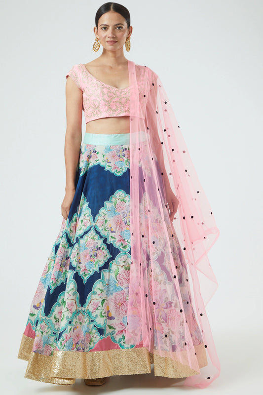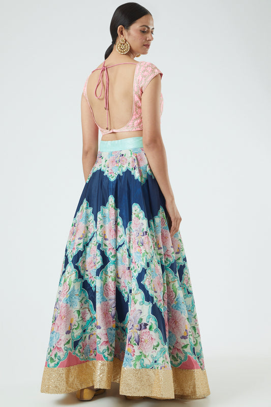Blue & Pink Silk Blend Floral Printed Lehenga Set