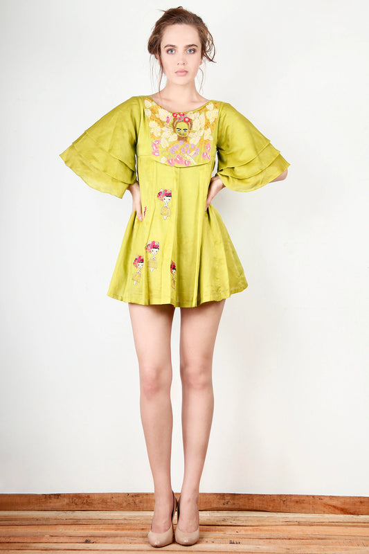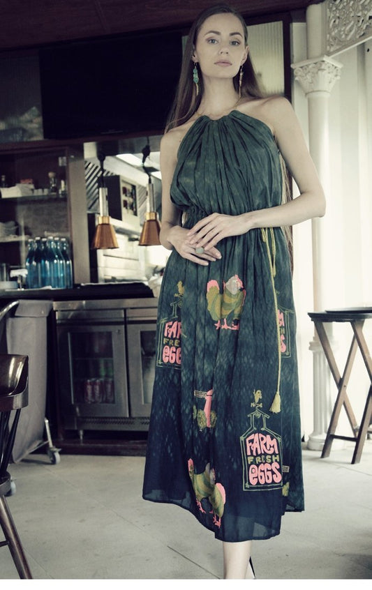 Green Cotton Silk Motif Embroidered Halter Tie-Dyed Dress with tie-ups