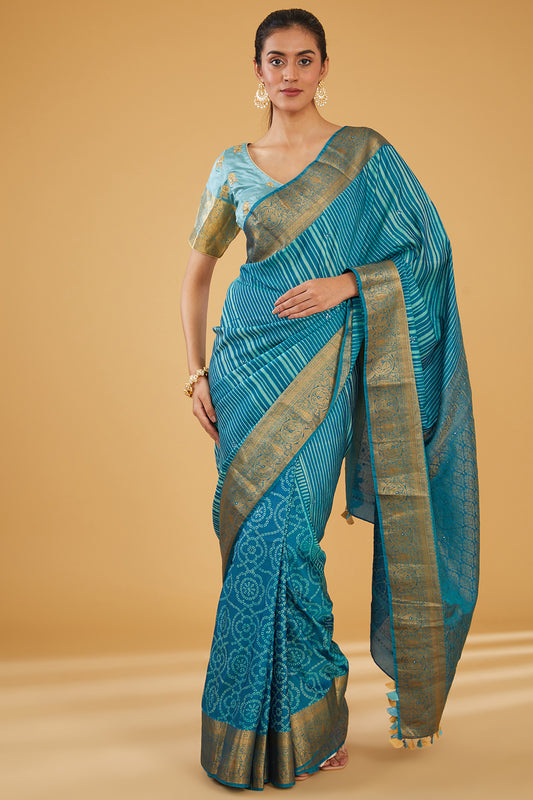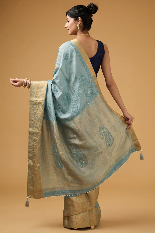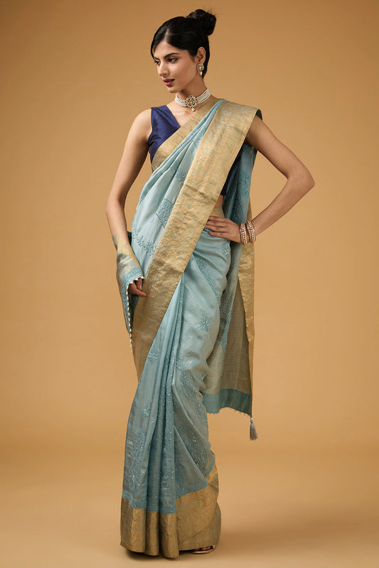 Bluish Grey Silk Chikankari Embroidered Saree Set