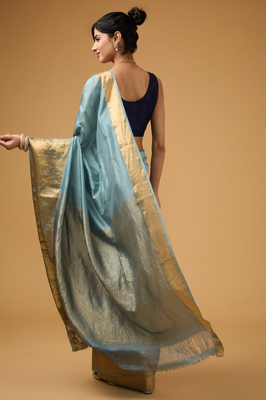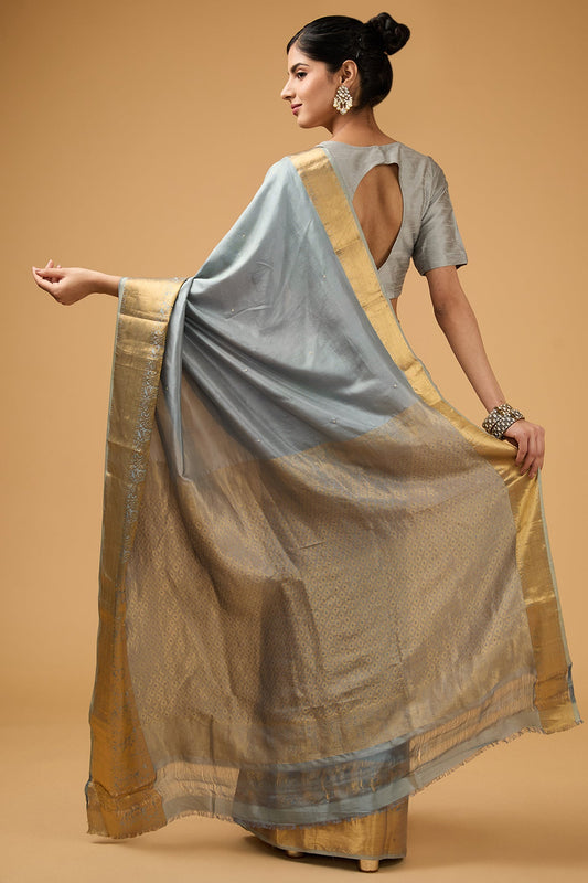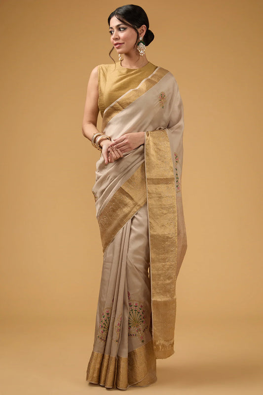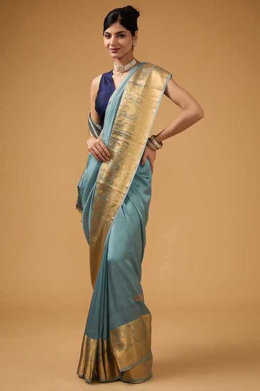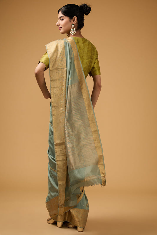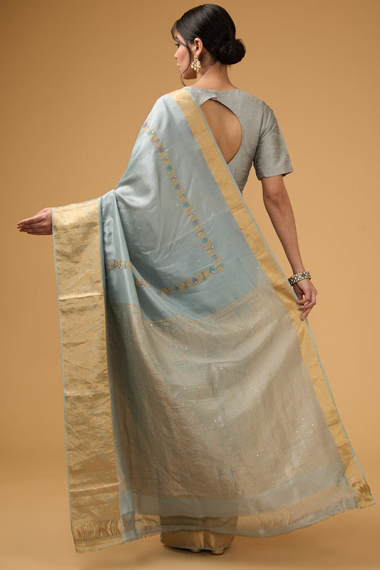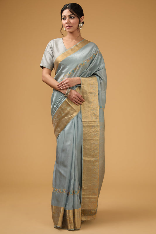 Greyish-Blue Silk Floral Motif Embroidered Saree Set