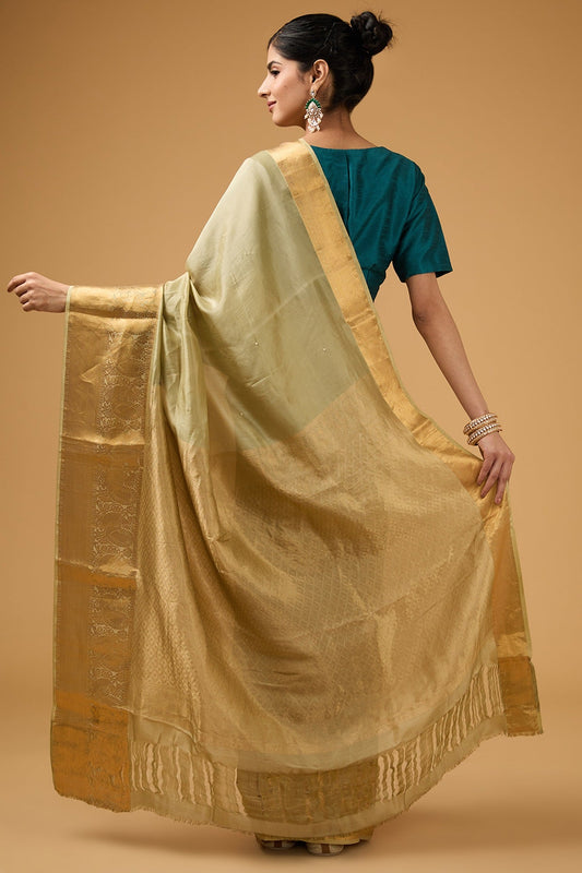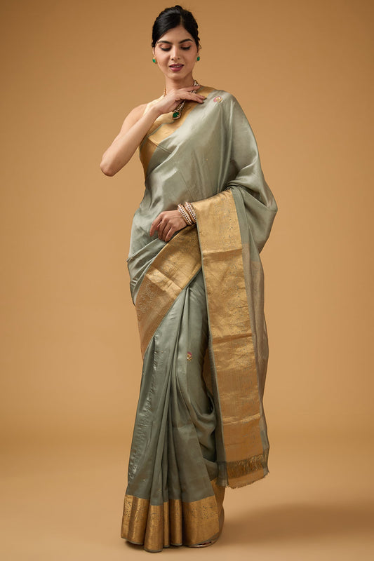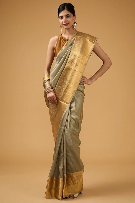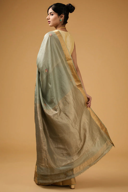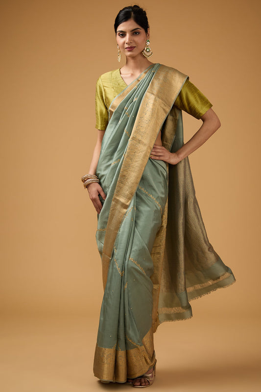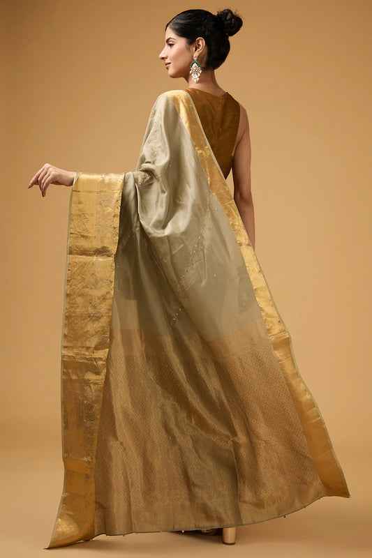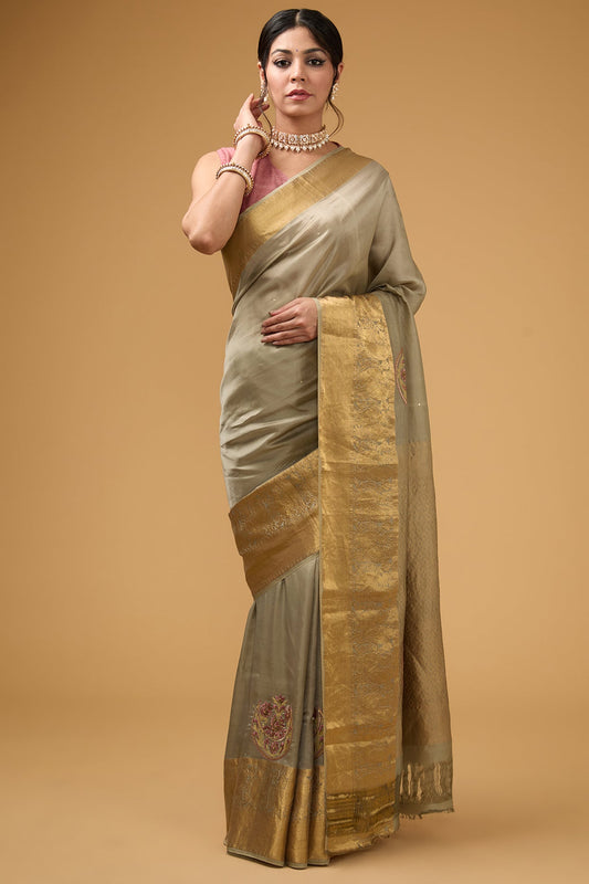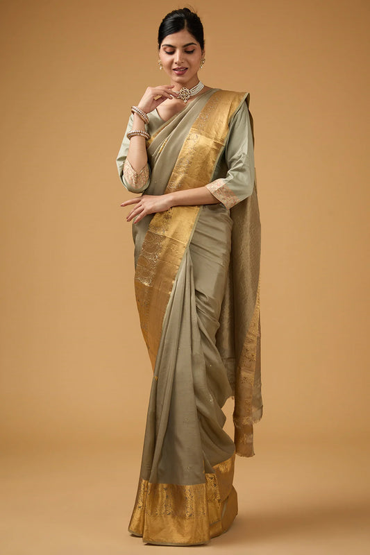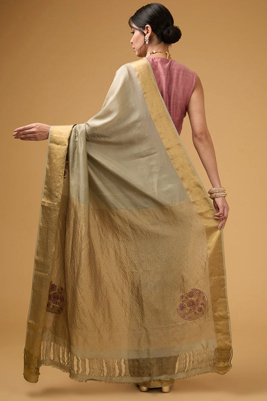Grey-Olive Green Silk Sequins Motif Embroidered Saree Set