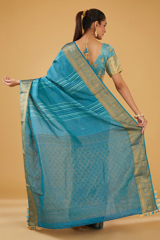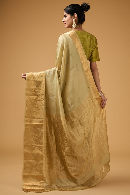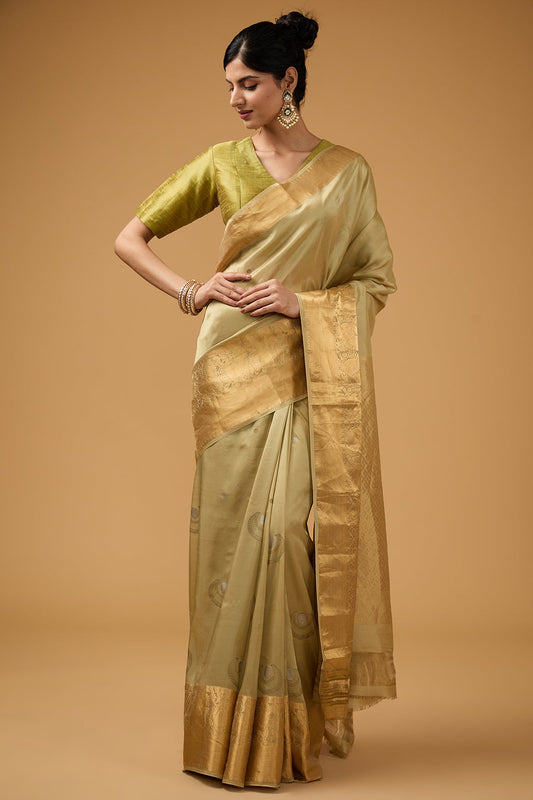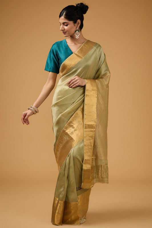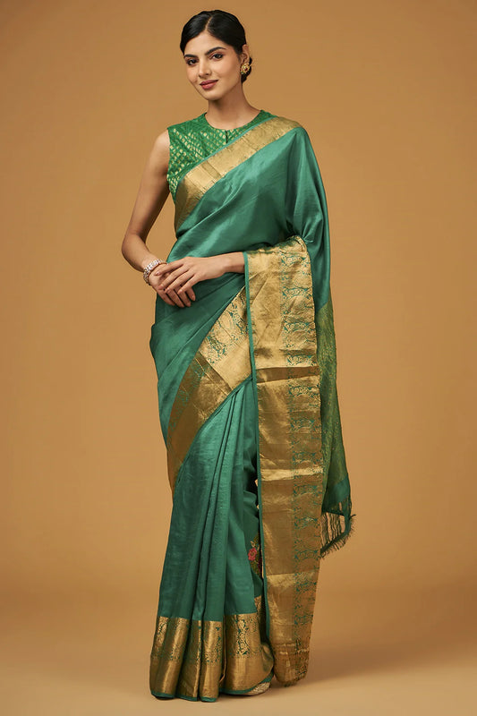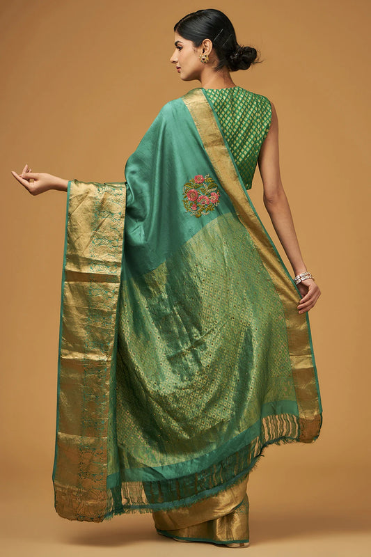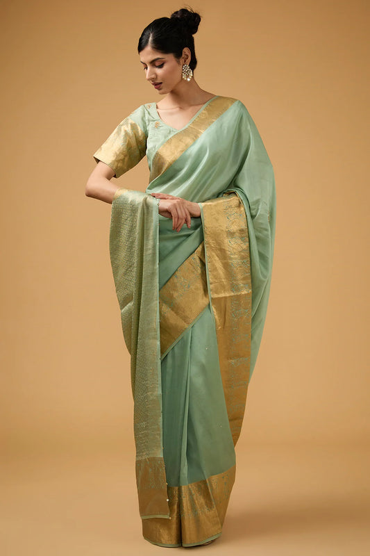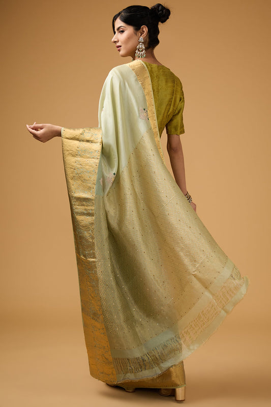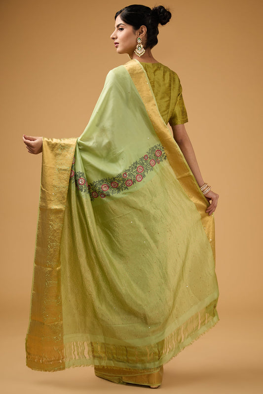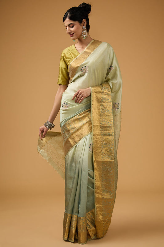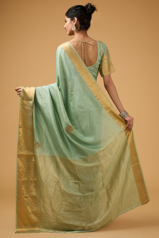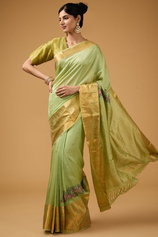 Pista Green Silk Floral Motif Embroidered Saree Set