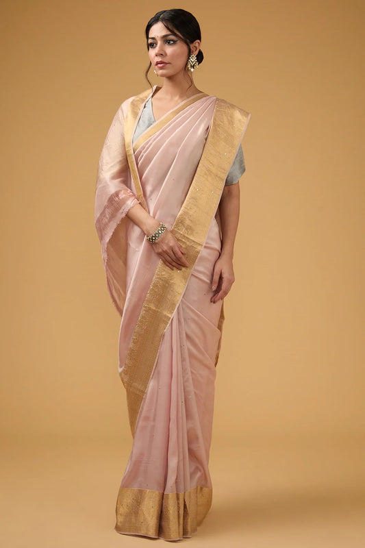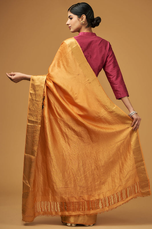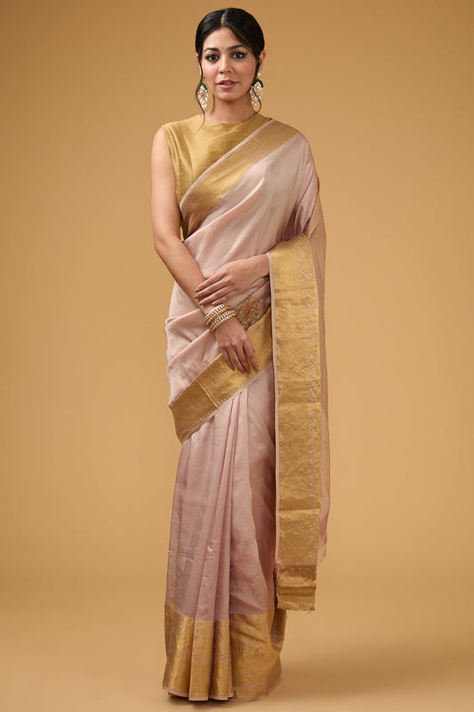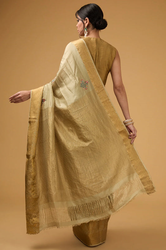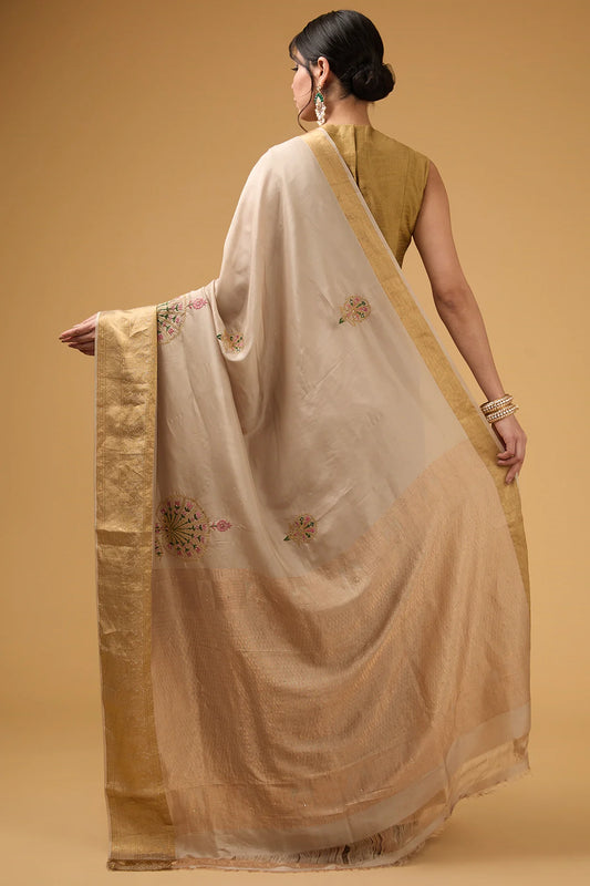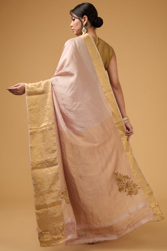 Beigish Peach Silk Floral Motif Embroidered Saree Set