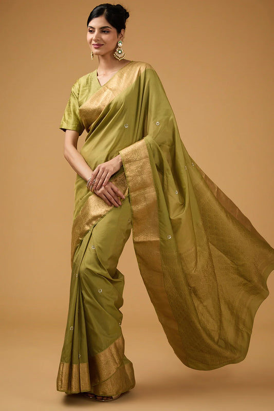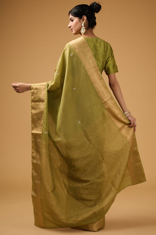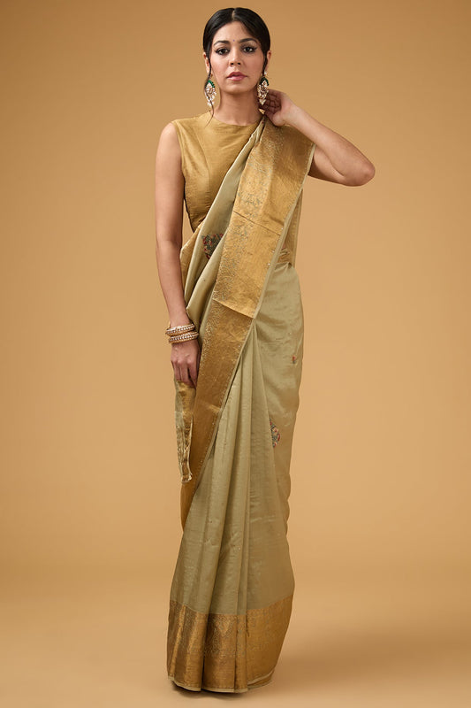 Olive Green Silk Floral Motifs Embroidered Saree Set