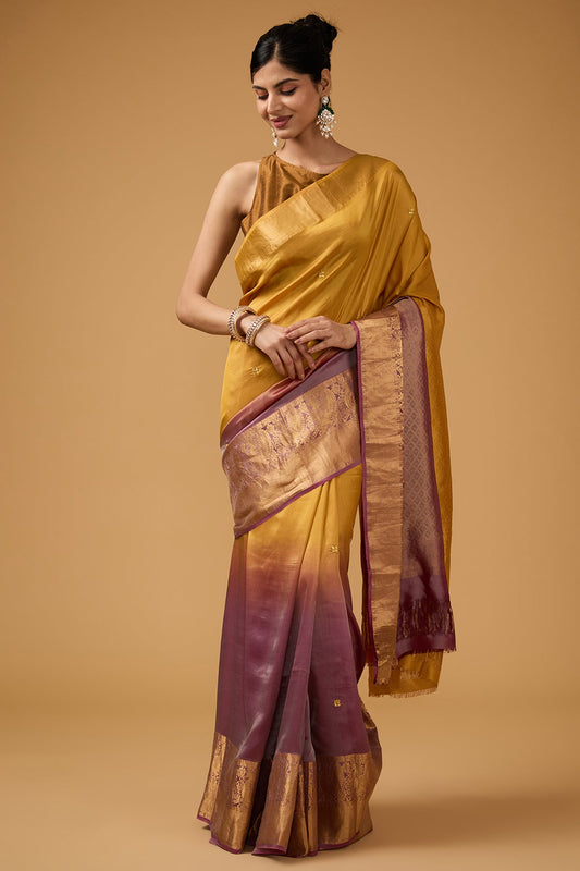 Mustard & Plum Silk Sequins Motif Embroidered Saree Set