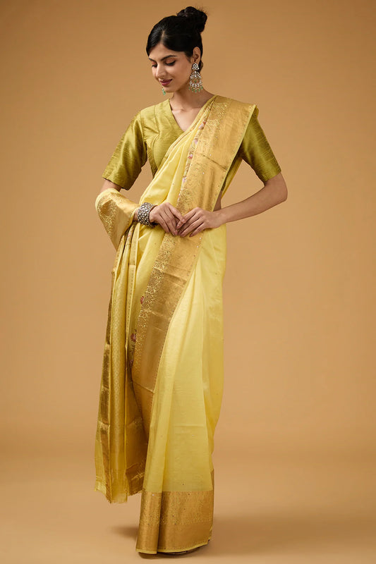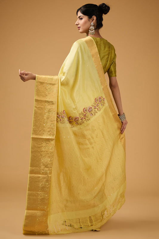 Lime Yellow Silk Floral Motif Embroidered Saree Set