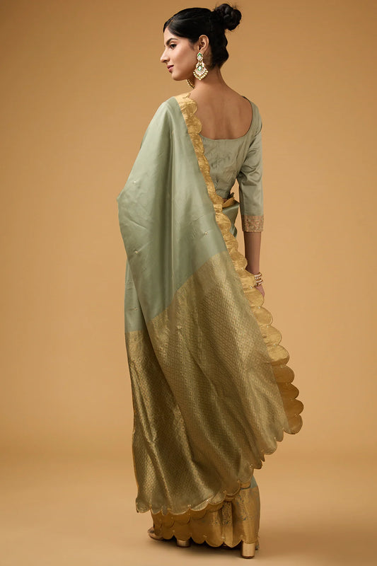 Pista Grey Green Silk Sequin Embroidered Saree Set