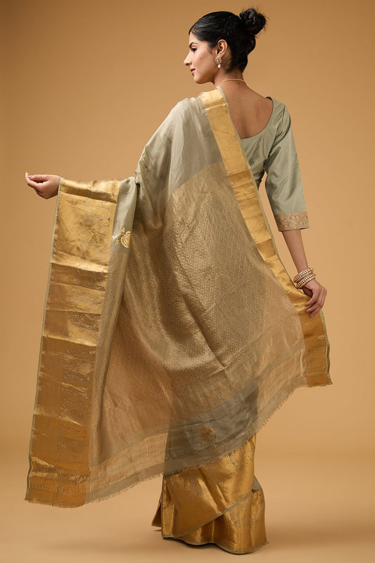 Grey-Pista Green Silk Floral Motif Embroidered Saree Set