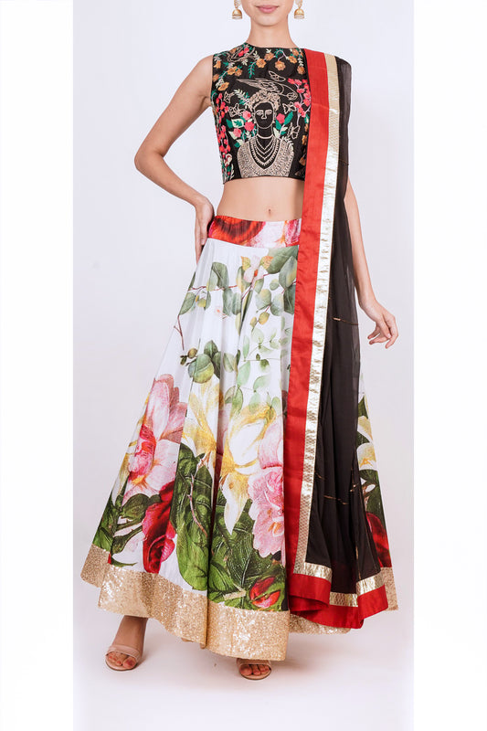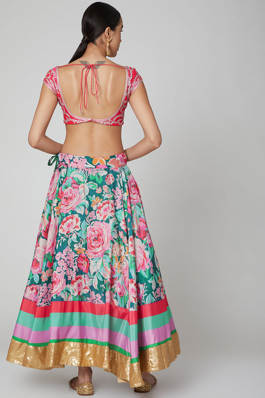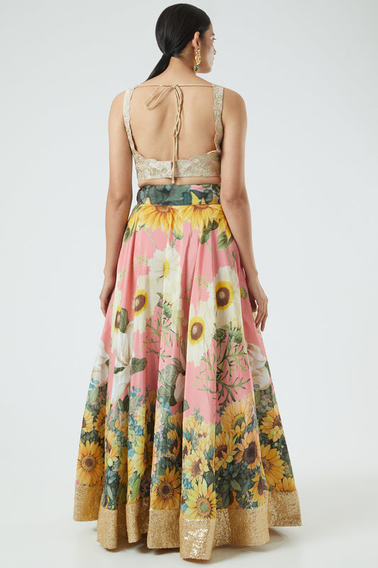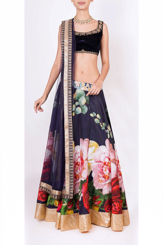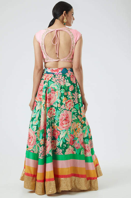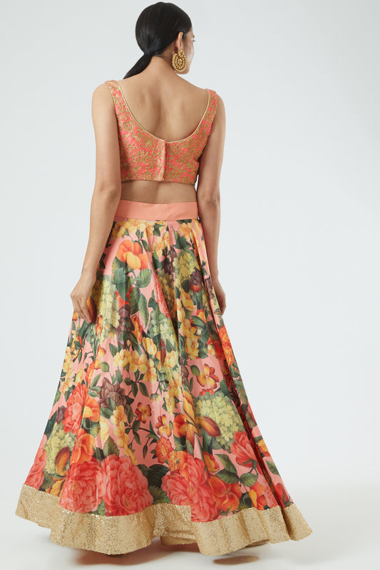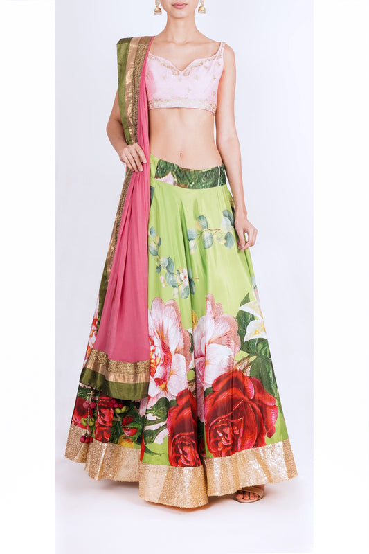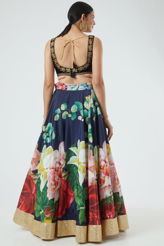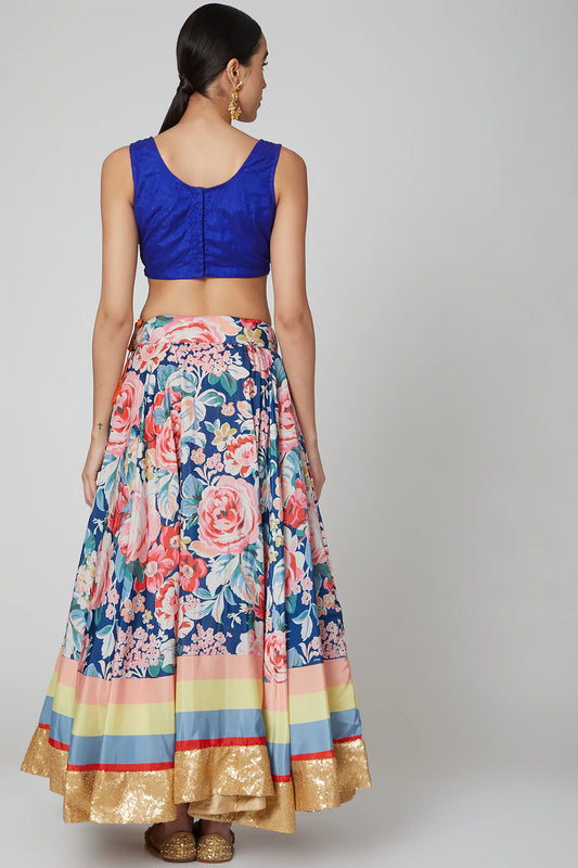 Blue & Pink Silk Blend Floral Printed Lehenga Set