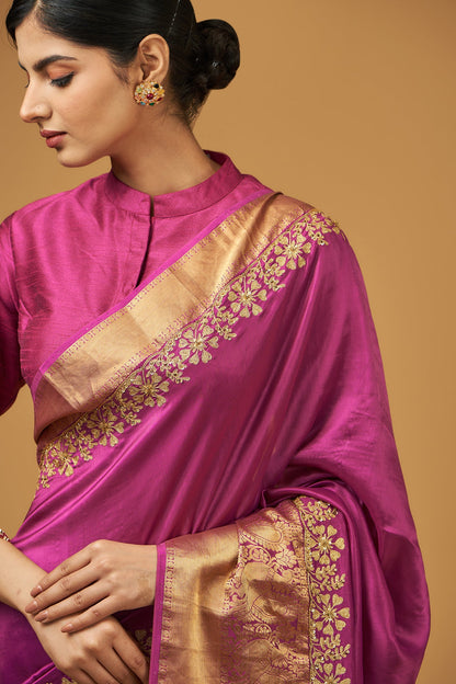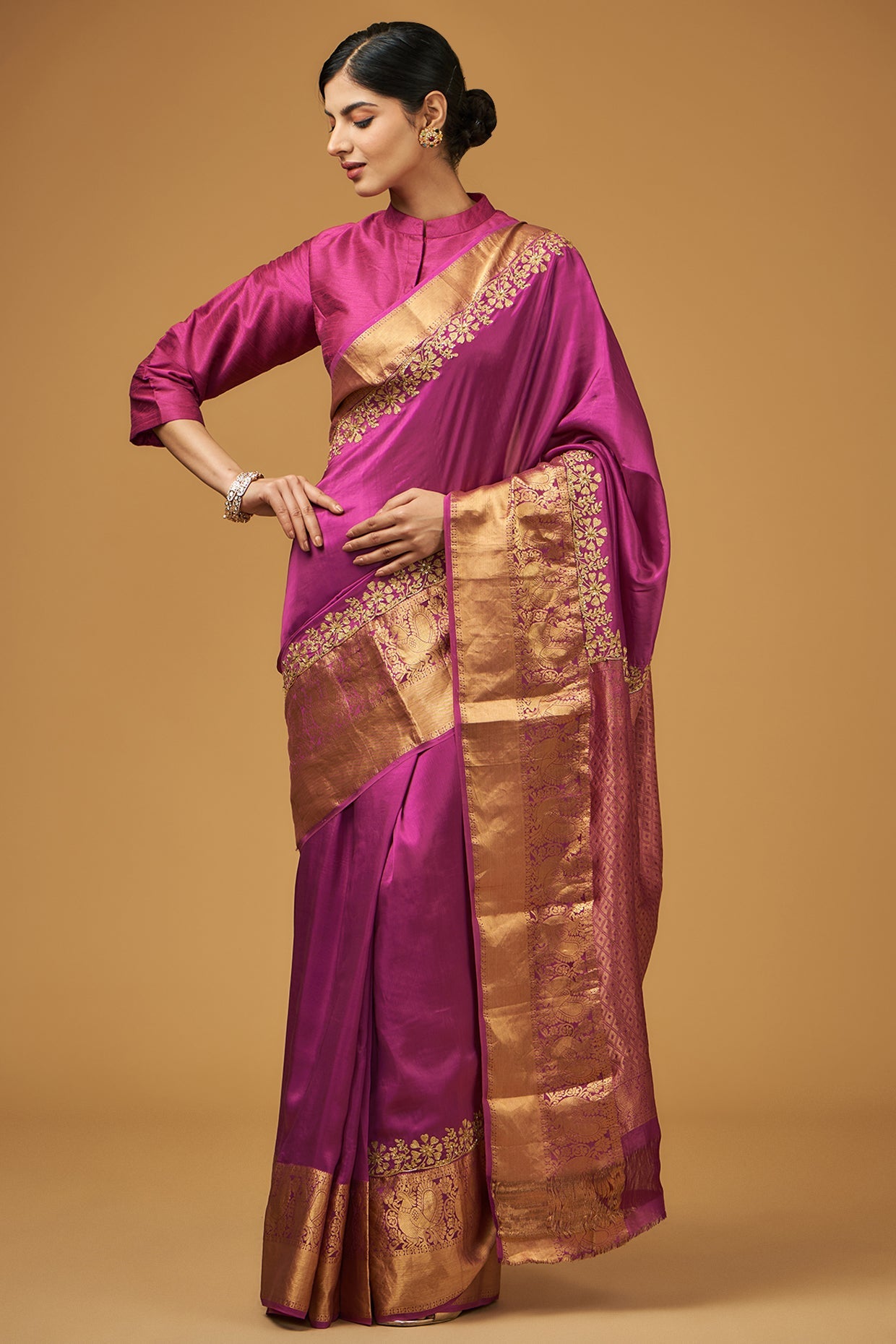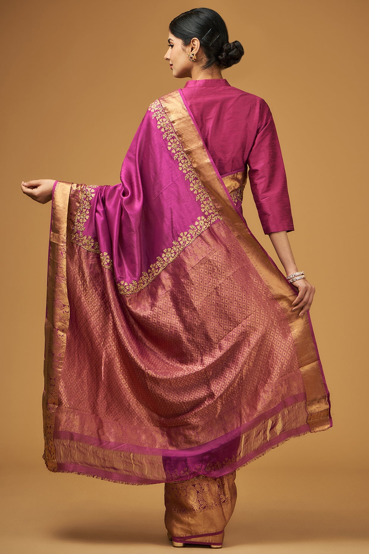 Featuring a peach saree in silk base with floral motif embroidery. It is paired with a blouse. Accentuate with dangler earrings and heels for a wedding, sangeet or engagement ceremony, exuding effortless sophistication.